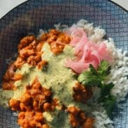 - Serve: Serve the butter cauliflower on rice and top with the mint sauce. Add pickled onions if you want. ENJOY!